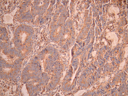 IHC image of CSB-RA203929A0HU diluted at 1:100 and staining in paraffin-embedded human colorectal cancer performed on a Leica BondTM system. After dewaxing and hydration, antigen retrieval was mediated by high pressure in a citrate buffer (pH 6.0). Section was blocked with 10% normal goat serum 30min at RT. Then primary antibody (1% BSA) was incubated at 4°C overnight. The primary is detected by a Goat anti-rabbit polymer IgG labeled by HRP and visualized using 0.05% DAB.