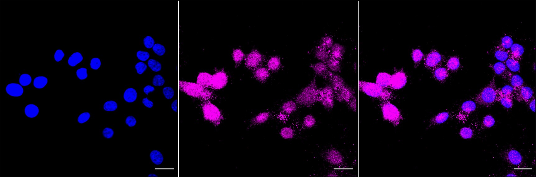 Immunocytochemical staining of HepG2 cells with Syndecan binding protein antibody. Nuclei were stained blue with DAPI; Syndecan binding protein was stained magenta with Alexa Fluor? 647. Images were taken using Leica stellaris 5. Protein abundance based on laser Intensity and smart gain: Medium. Scale bar, 20 μm.