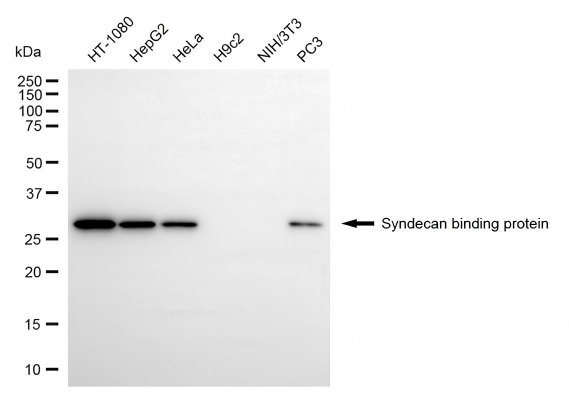 Western blotting analysis using syndecan binding protein antibody. Total cell lysates (30 μg) from various cell lines were loaded and separated by SDS-PAGE. The blot was incubated with syndecan binding protein antibody and HRP-conjugated goat anti-rabbit secondary antibody respectively.
