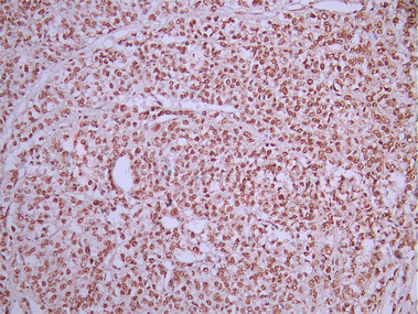 IHC image of CSB-RA124766A0HU diluted at 1:100 and staining in paraffin-embedded human breast cancer performed on a Leica BondTM system. After dewaxing and hydration, antigen retrieval was mediated by high pressure in a citrate buffer (pH 6.0). Section was blocked with 10% normal goat serum 30min at RT. Then primary antibody (1% BSA) was incubated at 4°C overnight. The primary is detected by a Goat anti-rabbit polymer IgG labeled by HRP and visualized using 0.05% DAB.