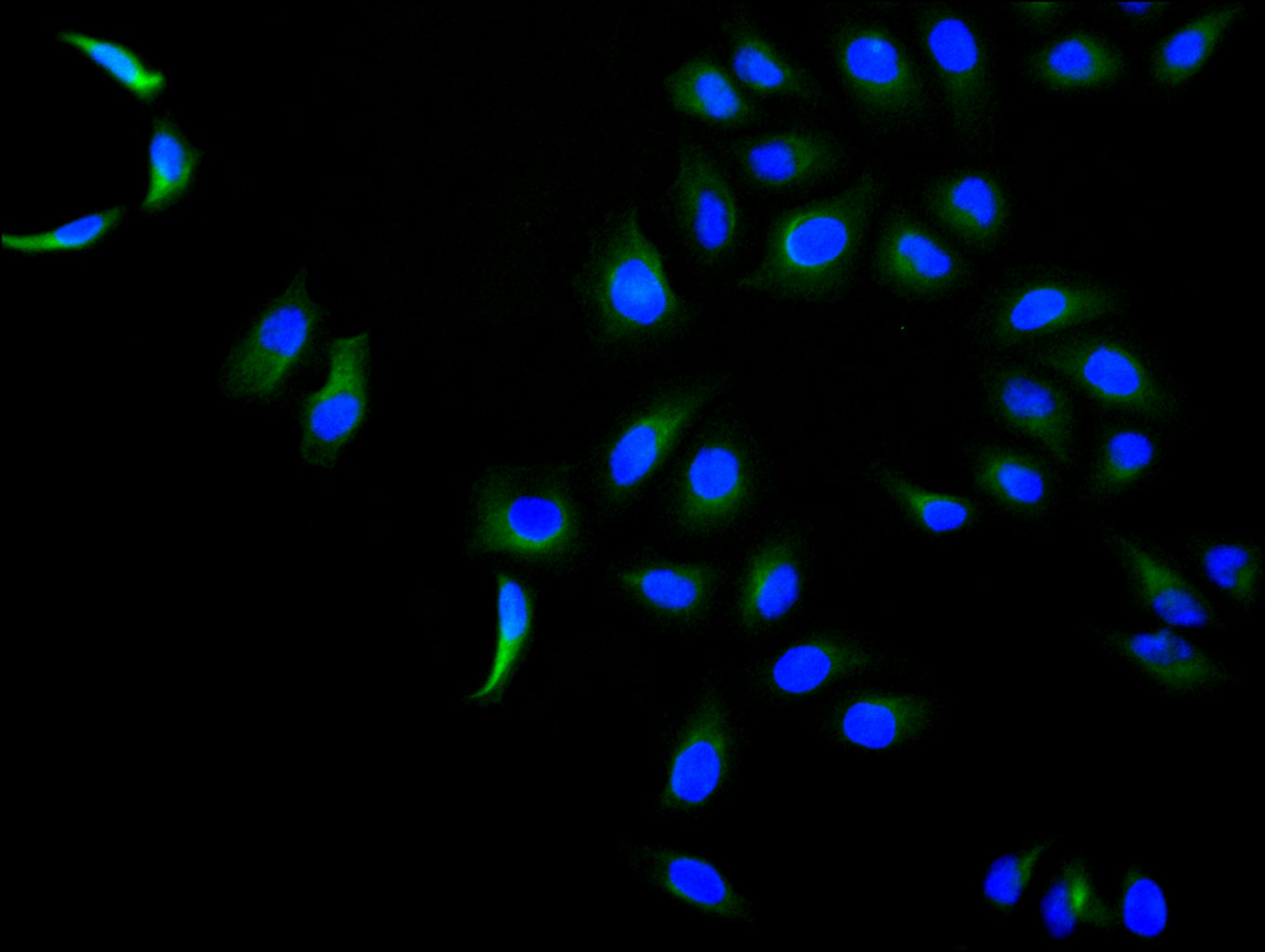 Immunofluorescence staining of Hela cell with CSB-RA822213MA1HU at 1:30 ,counter-stained with DAPI. The cells were fixed in 4% formaldehyde, permeabilized using 0.2% Triton X-100 and blocked in 10% normal Goat Serum. The cells were then incubated with the antibody overnight at 4°C. The secondary antibody was Fluorescein (FITC) AffiniPure Goat Anti-Human IgG, Fcγ fragment specific.