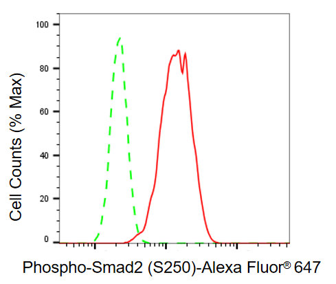 Flow cytometric analysis of phospho-Smad2 (S250) expression in C2C12 cells using phospho-Smad2 (S250) antibody. Green, isotype control; red, phospho-Smad2 (S250).