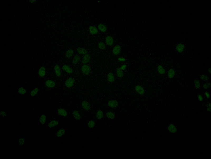Immunofluorescence staining of Hela with CSB-RA090878A0HU at 1:20, counter-stained with DAPI. The cells were fixed in 4% formaldehyde and blocked in 10% normal Goat Serum. The cells were then incubated with the antibody overnight at 4°C. The secondary antibody was Alexa Fluor 511-congugated AffiniPure Goat Anti-Rabbit IgG(H+L).