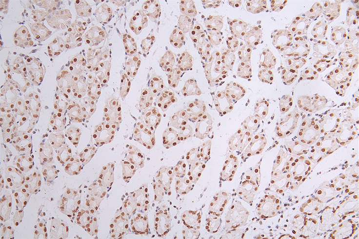 IHC image of CSB-RA090878A0HU diluted at 1:50 and staining in paraffin-embedded human stomach tissue performed on a Leica BondTM system. After dewaxing and hydration, antigen retrieval was mediated by high pressure in a citrate buffer (pH 6.0). Section was blocked with 10% normal goat serum 30min at RT. Then primary antibody (1% BSA) was incubated at 4°C overnight. The primary is detected by a Goat anti-rabbit polymer IgG labeled by HRP and visualized using 0.44% DAB.