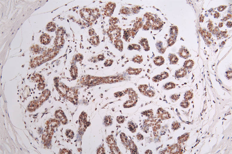 IHC image of CSB-RA090878A0HU diluted at 1:50 and staining in paraffin-embedded human breast cancer performed on a Leica BondTM system. After dewaxing and hydration, antigen retrieval was mediated by high pressure in a citrate buffer (pH 6.0). Section was blocked with 10% normal goat serum 30min at RT. Then primary antibody (1% BSA) was incubated at 4°C overnight. The primary is detected by a Goat anti-rabbit polymer IgG labeled by HRP and visualized using 0.44% DAB.