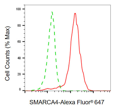 Flow cytometric analysis of SMARCA4 expression in HepG2 cells using SMARCA4 antibody. Green, isotype control; red, SMARCA4.