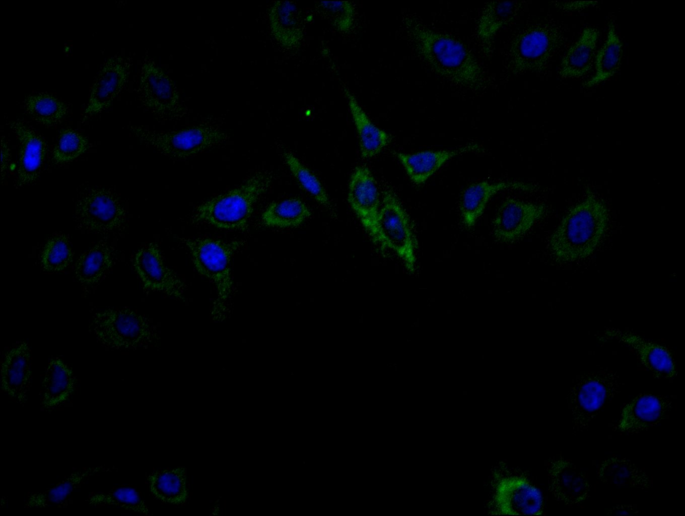 Immunofluorescence staining of Hela cell with CSB-RA199787A0HU at 1:50, counter-stained with DAPI. The cells were fixed in 4% formaldehyde, permeabilized using 0.2% Triton X-100 and blocked in 10% normal Goat Serum. The cells were then incubated with the antibody overnight at 4°C. The secondary antibody was Alexa Fluor 488-congugated AffiniPure Goat Anti-Rabbit IgG(H+L).