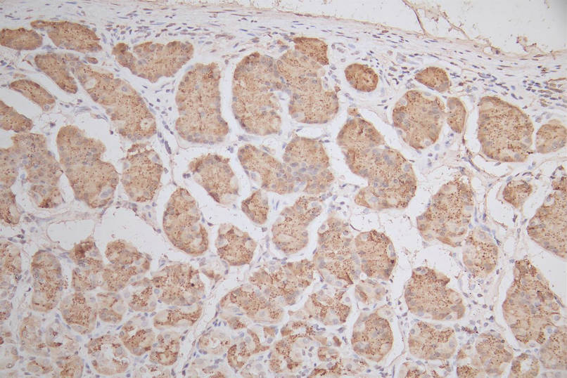 IHC image of CSB-RA022332MA1HU diluted at 1:50 and staining in paraffin-embedded human stomach tissue performed on a Leica BondTM system. After dewaxing and hydration, antigen retrieval was mediated by high pressure in a citrate buffer (pH 6.0). Section was blocked with 10% normal goat serum 30min at RT. Then primary antibody (1% BSA) was incubated at 4°C overnight. The primary is detected by a Goat anti-mouse polymer IgG labeled by HRP and visualized using 0.05% DAB.
