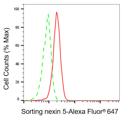Flow cytometric analysis of sorting nexin 5 expression in HAP-1 cells using sorting nexin 5 antibody. Green, isotype control; red, sorting nexin 5.