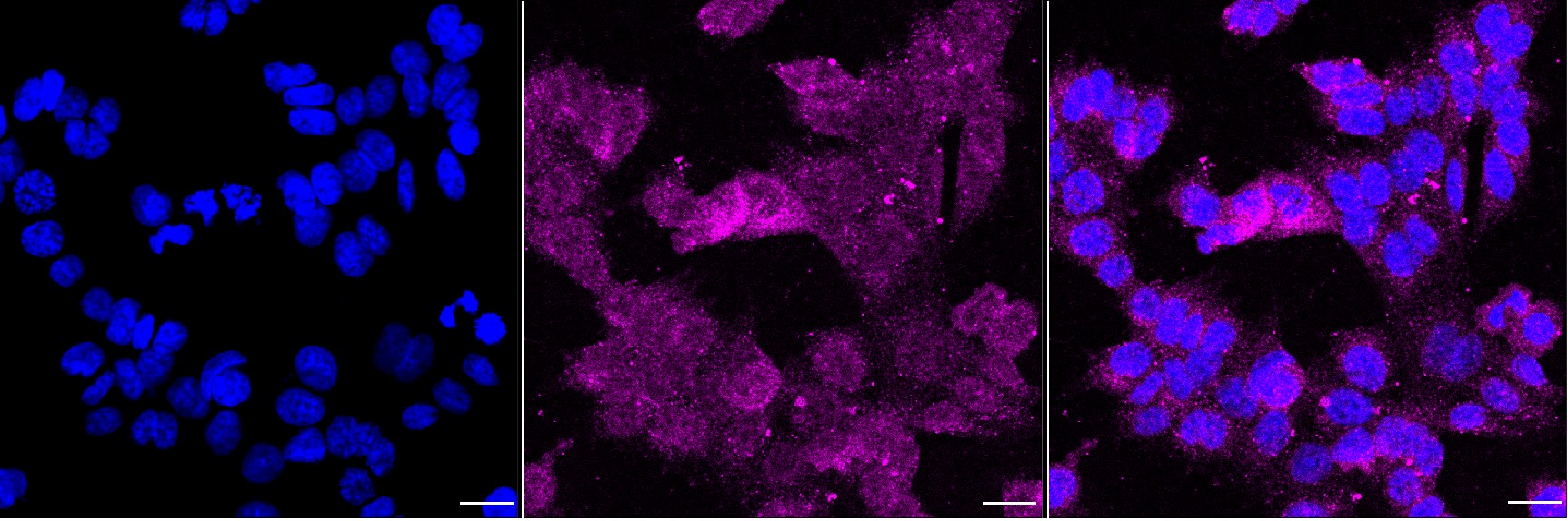 Immunocytochemical staining of HAP1 cells with Sorting nexin 5 antibody. Nuclei were stained blue with DAPI;Sorting nexin 5 was stained magenta with Alexa Fluor? 647. Images were taken using Leica stellaris 5. Protein abundance based on laser Intensity and smart gain:Low. Scale bar, 20 μm.