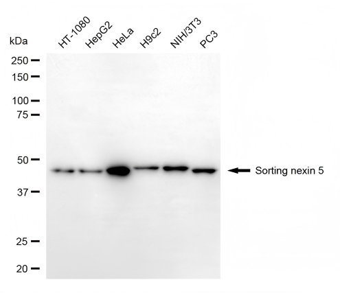 Western blotting analysis using sorting nexin 5 antibody. Total cell lysates (30 μg) from various cell lines were loaded and separated by SDS-PAGE. The blot was incubated with sorting nexin 5 antibody and HRP-conjugated goat anti-rabbit secondary antibody respectively.