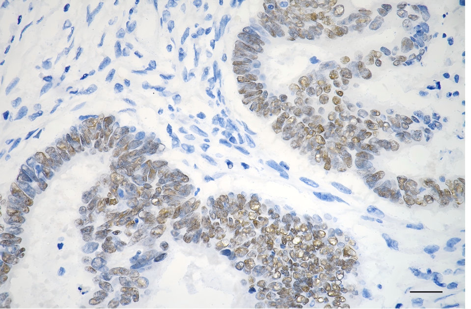 Immunohistochemistry was performed on paraffin-embedded human sigmoid colon carcinoma using SOX9 antibody. Antigen retrieval was done in sodium citrate buffer (pH 6.0). DAB was used for detection, with hematoxylin counterstaining. Images were acquired using a Nikon Ci-L Plus microscope (40× objective). Scale bar: 25 μm.