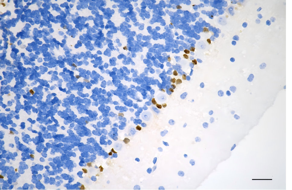 Immunohistochemistry was performed on paraffin-embedded mouse brain using SOX9 antibody. Antigen retrieval was done in sodium citrate buffer (pH 6.0). DAB was used for detection, with hematoxylin counterstaining. Images were acquired using a Nikon Ci-L Plus microscope (40× objective). Scale bar: 25 μm.