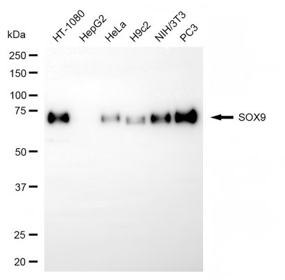Western blotting analysis using SOX9 antibody. Total cell lysates (30 μg) from various cell lines were loaded and separated by SDS-PAGE. The blot was incubated with SOX9 antibody and HRP-conjugated goat anti-rabbit secondary antibody respectively.