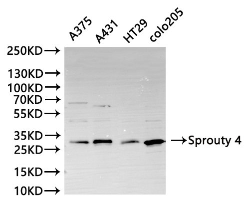 Positive WB detected in: A375 whole cell lysate(30μg), A431 whole cell lysate(30μg), HT29 whole cell lysate(30μg), colo205 whole cell lysate(30μg)