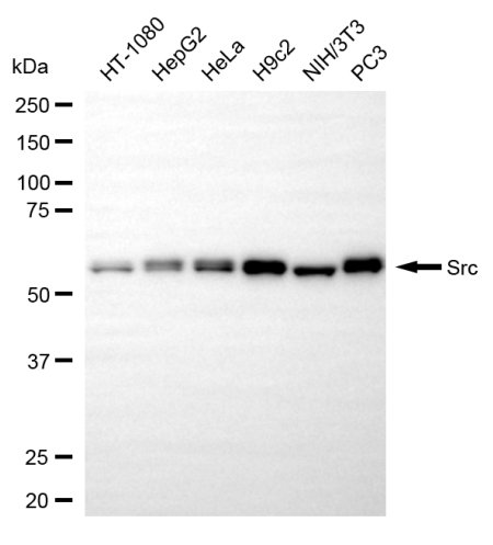 Western blotting analysis using src antibody. Total cell lysates (30 μg) from various cell lines were loaded and separated by SDS-PAGE. The blot was incubated with src antibody and HRP-conjugated goat anti-rabbit secondary antibody respectively.