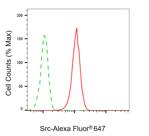 Flow cytometric analysis of Src expression in HAP-1 cells using Src antibody. Green, isotype control; red, Src.