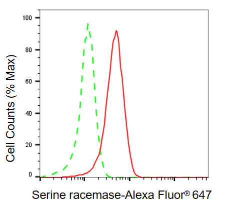 Flow cytometric analysis of serine racemase expression in HepG2 cells using serine racemase antibody. Green, isotype control; red, serine racemase.
