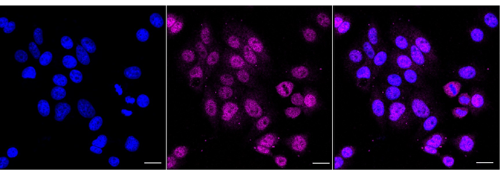 Immunocytochemical staining of HepG2 cells with Serine racemase antibody. Nuclei were stained blue with DAPI; Serine racemase was stained magenta with Alexa Fluor? 647. Images were taken using Leica stellaris 5. Protein abundance based on laser Intensity and smart gain: Medium. Scale bar, 20 μm.