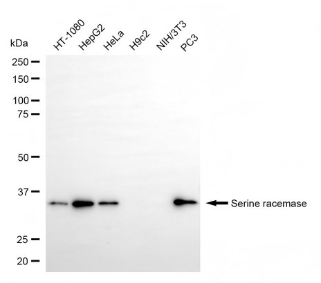 Western blotting analysis using serine racemase antibody. Total cell lysates (30 μg) from various cell lines were loaded and separated by SDS-PAGE. The blot was incubated with serine racemase antibody and HRP-conjugated goat anti-rabbit secondary antibody respectively.
