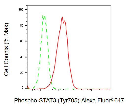 Flow cytometric analysis of phospho-STAT3 (Tyr705) expression in H9c2 cells using phospho-STAT3 (Tyr705) antibody. Green, isotype control; red, phospho-STAT3 (Tyr705).