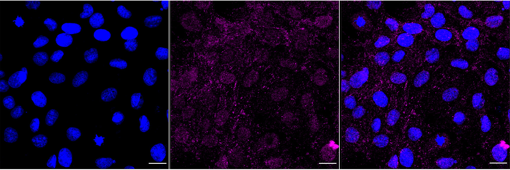 Immunocytochemical staining of H9C2 cells with phospho-STAT3 (Tyr705) antibody. Nuclei were stained blue with DAPI; Phospho-STAT3 (Tyr705) was stained magenta with Alexa Fluor? 647. Images were taken using Leica stellaris 5. Protein abundance based on laser Intensity and smart gain: Low. Scale bar, 20 μm.