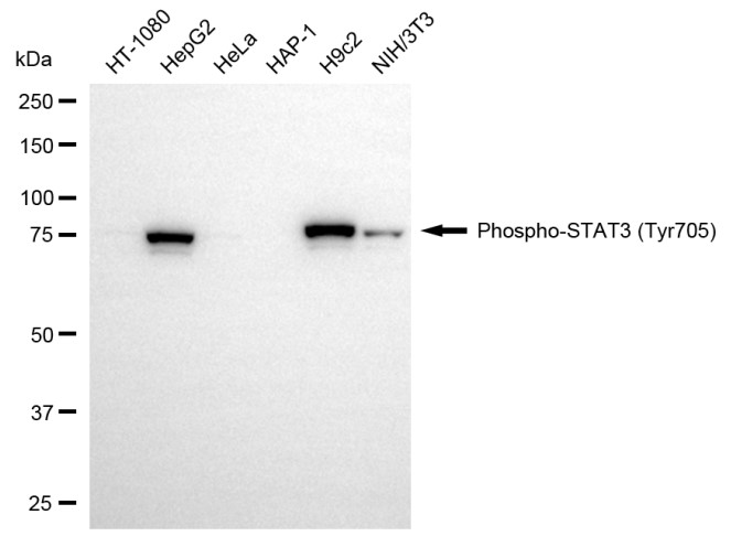 Western blotting analysis using phospho-STAT3 (Tyr705) antibody. Total cell lysates (30 μg) from various cell lines were loaded and separated by SDS-PAGE. The blot was incubated with phospho-STAT3 (Tyr705) antibody and HRP-conjugated goat anti-rabbit secondary antibody respectively.