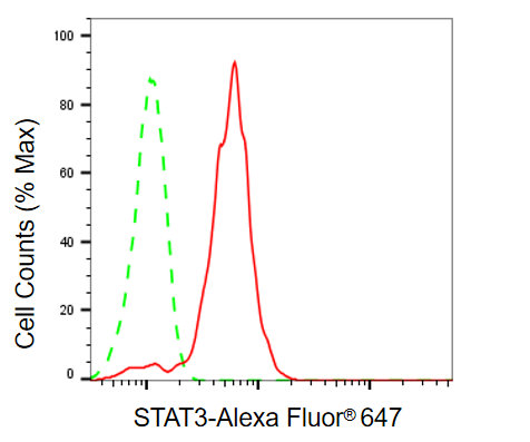 Flow cytometric analysis of STAT3 expression in HepG2 cells using STAT3 antibody. Green, isotype control; red, STAT3.