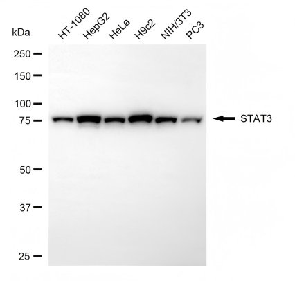 Western blotting analysis using STAT3 antibody. Total cell lysates (30 μg) from various cell lines were loaded and separated by SDS-PAGE. The blot was incubated with STAT3 antibody and HRP-conjugated goat anti-rabbit secondary antibody respectively.