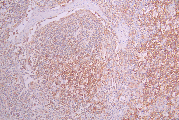 IHC image of CSB-RA915422A0HU diluted at 1:100 and staining in paraffin-embedded human lymph node tissue performed on a Leica BondTM system. After dewaxing and hydration, antigen retrieval was mediated by high pressure in a citrate buffer (pH 6.0). Section was blocked with 10% normal goat serum 30min at RT. Then primary antibody (1% BSA) was incubated at 4°C overnight. The primary is detected by a Goat anti-rabbit polymer IgG labeled by HRP and visualized using 0.05% DAB.