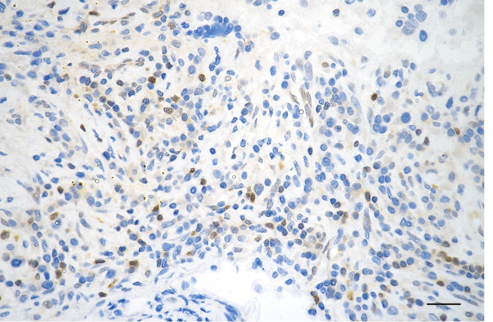 Immunohistochemistry was performed on paraffin-embedded human breast carcinoma using STAT5B antibody. Antigen retrieval was done in sodium citrate buffer (pH 6.0). DAB was used for detection, with hematoxylin counterstaining. Images were acquired using a Nikon Ci-L Plus microscope (40× objective). Scale bar: 25 μm.