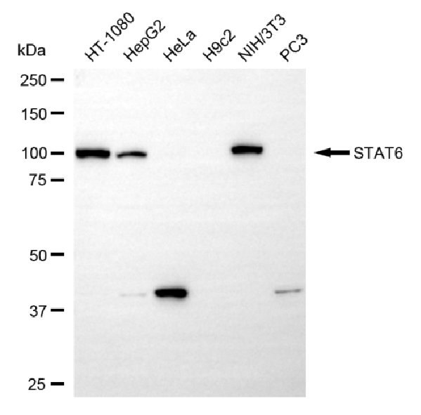 Western blotting analysis using STAT6 antibody. Total cell lysates (30 μg) from various cell lines were loaded and separated by SDS-PAGE. The blot was incubated with STAT6 antibody and HRP-conjugated goat anti-rabbit secondary antibody respectively.