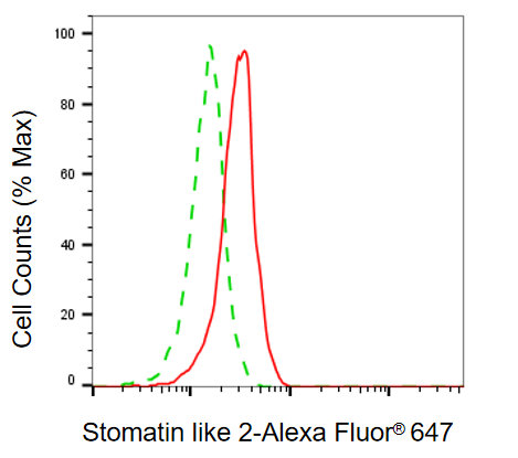 Flow cytometric analysis of stomatin like 2 expression in HepG2 cells using stomatin like 2 antibody. Green, isotype control; red, stomatin like 2.