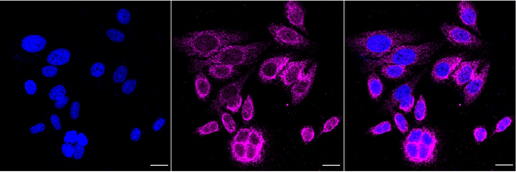Immunocytochemical staining of HepG2 cells with Stomatin like 2 antibody. Nuclei were stained blue with DAPI; Stomatin like 2 was stained magenta with Alexa Fluor? 647. Images were taken using Leica stellaris 5. Protein abundance based on laser Intensity and smart gain: Medium. Scale bar, 20 μm.