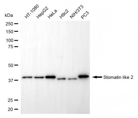 Western blotting analysis using stomatin like 2 antibody. Total cell lysates (30 μg) from various cell lines were loaded and separated by SDS-PAGE. The blot was incubated with stomatin like 2 antibody and HRP-conjugated goat anti-rabbit secondary antibody respectively.