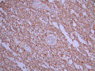 IHC image of CSB-RA545009A0HU diluted at 1:100 and staining in paraffin-embedded human glioma cancer performed on a Leica BondTM system. After dewaxing and hydration, antigen retrieval was mediated by high pressure in a citrate buffer (pH 6.0). Section was blocked with 10% normal goat serum 30min at RT. Then primary antibody (1% BSA) was incubated at 4°C overnight. The primary is detected by a Goat anti-rabbit polymer IgG labeled by HRP and visualized using 0.05% DAB.