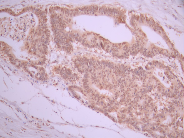 IHC image of CSB-RA269987A0HU diluted at 1:100 and staining in paraffin-embedded human colorectal cancer performed on a Leica BondTM system. After dewaxing and hydration, antigen retrieval was mediated by high pressure in a citrate buffer (pH 6.0). Section was blocked with 10% normal goat serum 30min at RT. Then primary antibody (1% BSA) was incubated at 4°C overnight. The primary is detected by a Goat anti-rabbit polymer IgG labeled by HRP and visualized using 0.05% DAB.