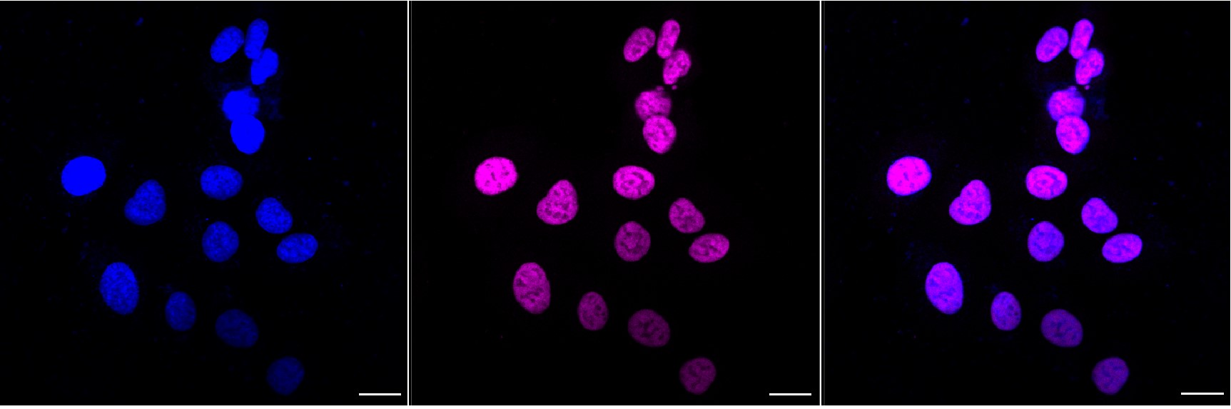Immunocytochemical staining of HT-1080 cells with SUPT5H antibody. Nuclei were stained blue with DAPI; SUPT5H was stained magenta with Alexa Fluor? 647. Images were taken using Leica stellaris 5. Protein abundance based on laser Intensity and smart gain: High. Scale bar, 20 μm.