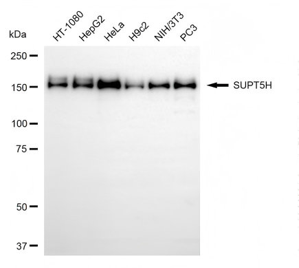 Western blotting analysis using SUPT5H antibody. Total cell lysates (30 μg) from various cell lines were loaded and separated by SDS-PAGE. The blot was incubated with SUPT5H antibody and HRP-conjugated goat anti-rabbit secondary antibody respectively.