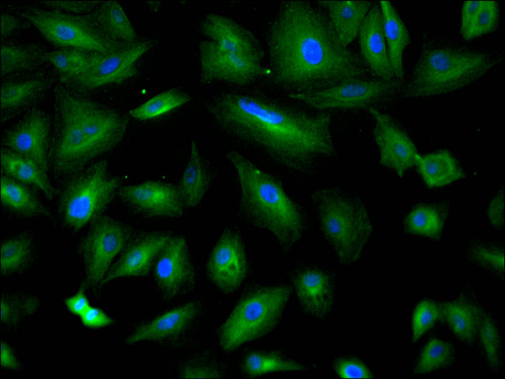 Immunofluorescence staining of A549 cell with CSB-RA159195A0HU at 1:50, counter-stained with DAPI. The cells were fixed in 4% formaldehyde, permeabilized using 0.2% Triton X-100 and blocked in 10% normal Goat Serum. The cells were then incubated with the antibody overnight at 4°C. The secondary antibody was Alexa Fluor 488-congugated AffiniPure Goat Anti-Rabbit IgG(H+L).