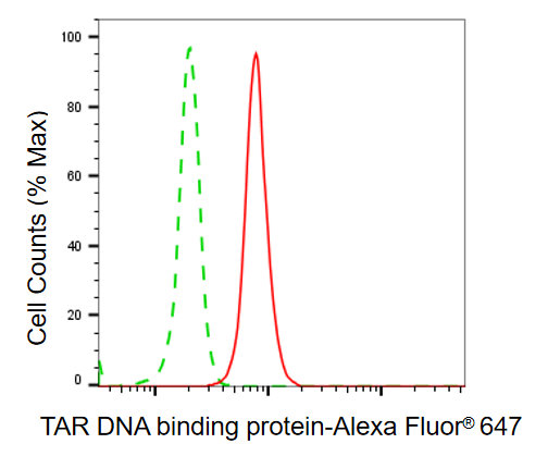 Flow cytometric analysis of TAR DNA binding protein expression in C2C12 cells using TAR DNA binding protein antibody. Green, isotype control; red, TAR DNA binding protein.