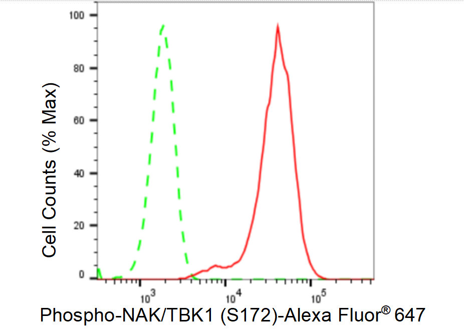 Flow cytometric analysis of Phospho-NAK/TBK1 (S172) expression in HepG2 cells using Phospho-NAK/TBK1 (S172) antibody. Green, isotype control; red, Phospho-NAK/TBK1 (S172).