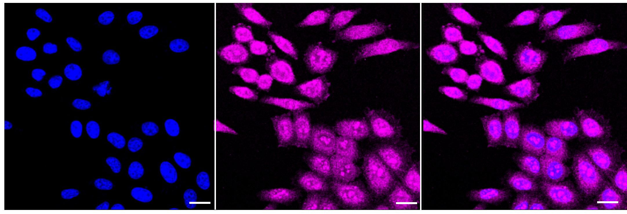 Immunocytochemical staining of HepG2 cells with Phospho-NAK/TBK1 (S172) antibody. Nuclei were stained blue with DAPI; Phospho-NAK/TBK1 (S172) was stained magenta with Alexa Fluor? 647. Images were taken using Leica stellaris 5. Protein abundance based on laser Intensity and smart gain: Medium. Scale bar: 20 μm.