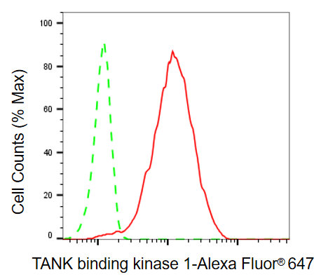 Flow cytometric analysis of TANK binding kinase 1 expression in HepG2 cells using TANK binding kinase 1 antibody. Green, isotype control; red, TANK binding kinase 1.