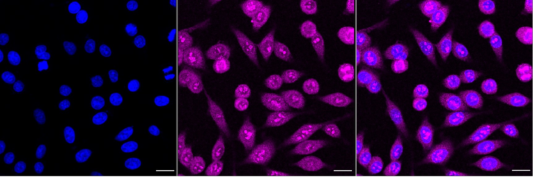 Immunocytochemical staining of HepG2 cells with TANK binding kinase 1 antibody. Nuclei were stained blue with DAPI; TANK binding kinase 1 was stained magenta with Alexa Fluor? 647. Images were taken using Leica stellaris 5. Protein abundance based on laser Intensity and smart gain: Medium. Scale bar, 20 μm.