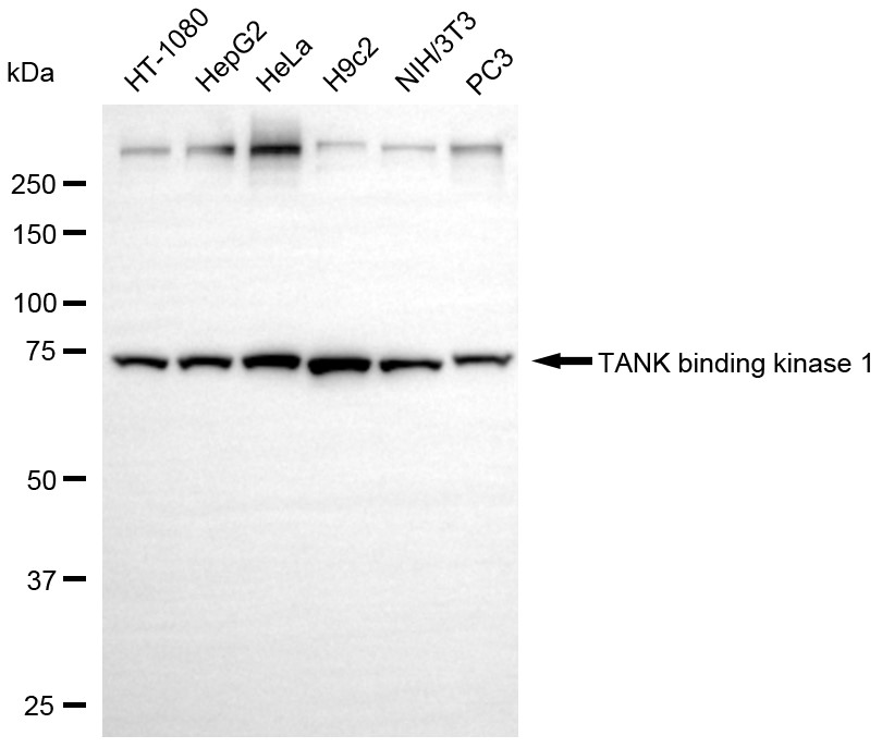 Western blotting analysis using TANK binding kinase 1 antibody. Total cell lysates (30 μg) from various cell lines were loaded and separated by SDS-PAGE. The blot was incubated with TANK binding kinase 1 antibody and HRP-conjugated goat anti-rabbit secondary antibody respectively.