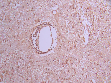 IHC image of CSB-RA198357A0HU diluted at 1:100 and staining in paraffin-embedded human glioma cancer performed on a Leica BondTM system. After dewaxing and hydration, antigen retrieval was mediated by high pressure in a citrate buffer (pH 6.0). Section was blocked with 10% normal goat serum 30min at RT. Then primary antibody (1% BSA) was incubated at 4°C overnight. The primary is detected by a Goat anti-rabbit polymer IgG labeled by HRP and visualized using 0.05% DAB.
