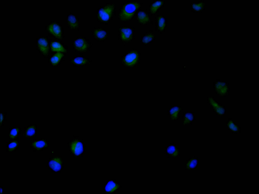 Immunofluorescence staining of Hela cell with CSB-RA056950A0HU at 1:50, counter-stained with DAPI. The cells were fixed in 4% formaldehyde, permeabilized using 0.2% Triton X-100 and blocked in 10% normal Goat Serum. The cells were then incubated with the antibody overnight at 4°C. The secondary antibody was Alexa Fluor 488-congugated AffiniPure Goat Anti-Rabbit IgG(H+L).