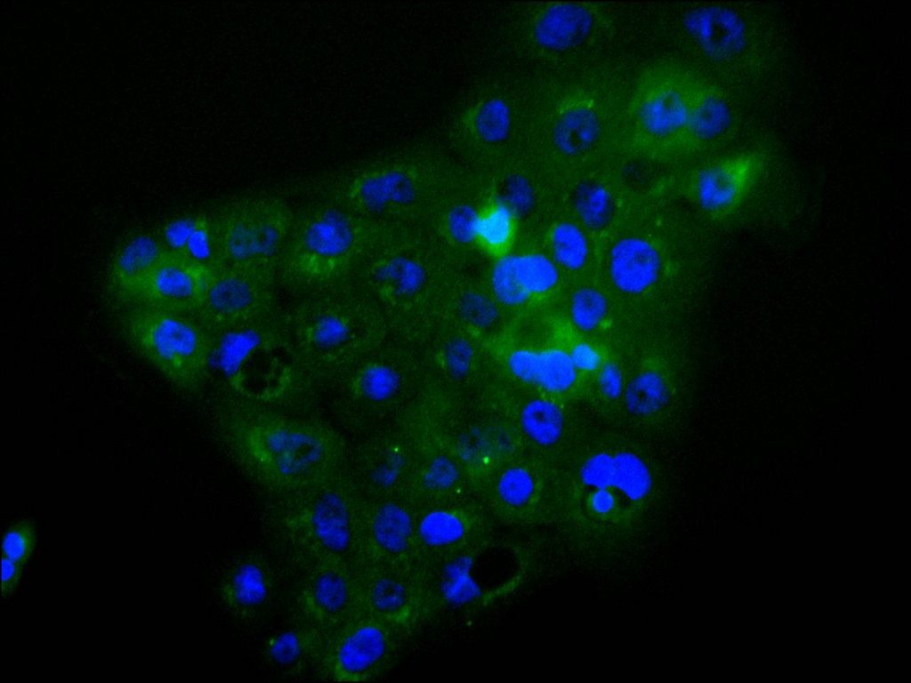 Immunofluorescence staining of A431 cell with CSB-RA110287A0HU at 1:50, counter-stained with DAPI. The cells were fixed in 4% formaldehyde, permeabilized using 0.2% Triton X-100 and blocked in 10% normal Goat Serum. The cells were then incubated with the antibody overnight at 4°C. The secondary antibody was Alexa Fluor 488-congugated AffiniPure Goat Anti-Rabbit IgG(H+L).
