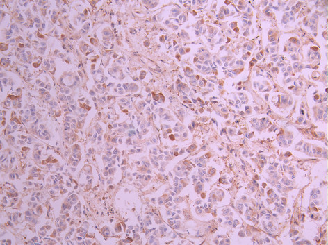 IHC image of CSB-RA110287A0HU diluted at 1:100 and staining in paraffin-embedded human breast cancer performed on a Leica BondTM system. After dewaxing and hydration, antigen retrieval was mediated by high pressure in a citrate buffer (pH 6.0). Section was blocked with 10% normal goat serum 30min at RT. Then primary antibody (1% BSA) was incubated at 4°C overnight. The primary is detected by a Goat anti-rabbit polymer IgG labeled by HRP and visualized using 0.05% DAB.